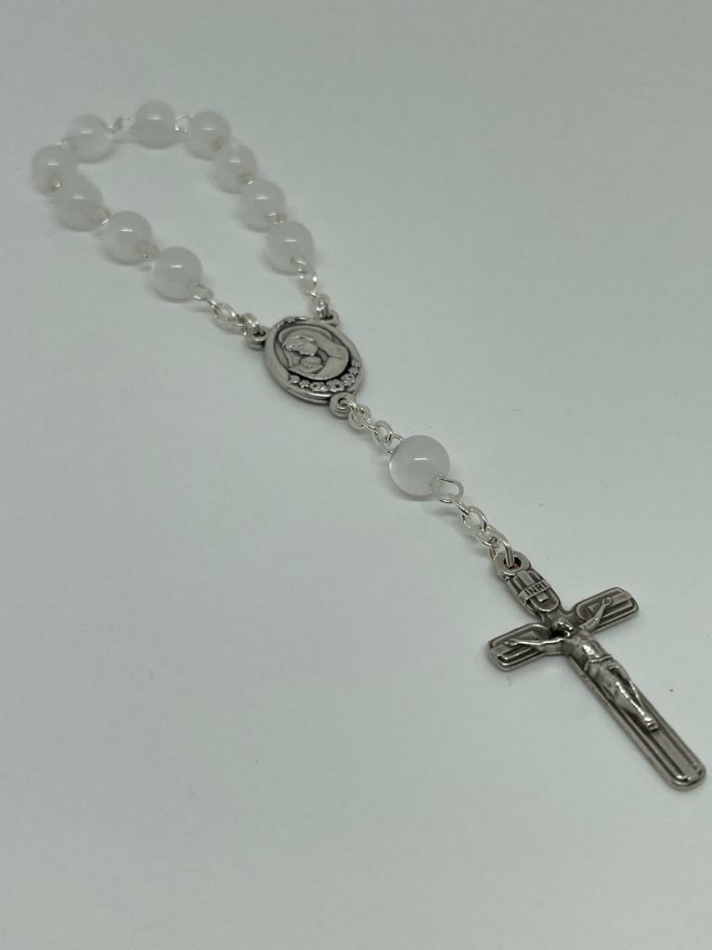Decina in vetro perlato bianco con medaglia Madonna e retro Sacro Cuore di Gesù