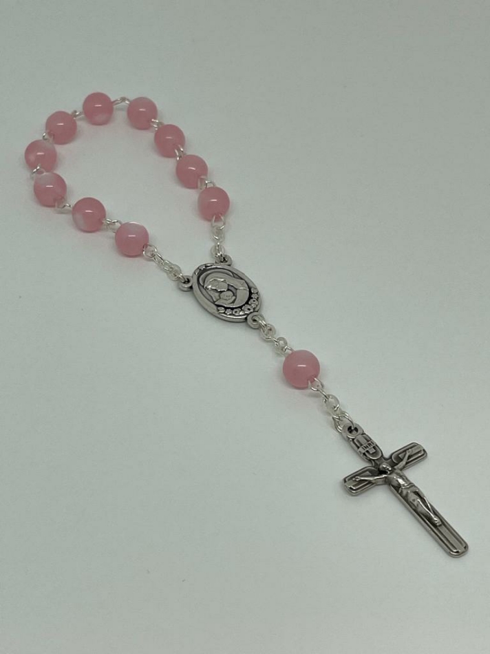 Decina in vetro rosa con medaglia Sacro cuore di Gesù e Madonna