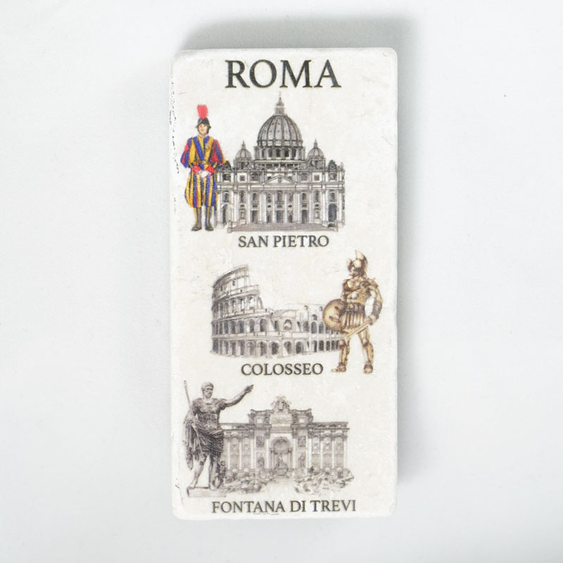 Calamita in vero marmo italiano, souvenir ricordo di Roma, a forma rettangolare con raffigurati San Pietro, Colosseo e Fontana di Trevi