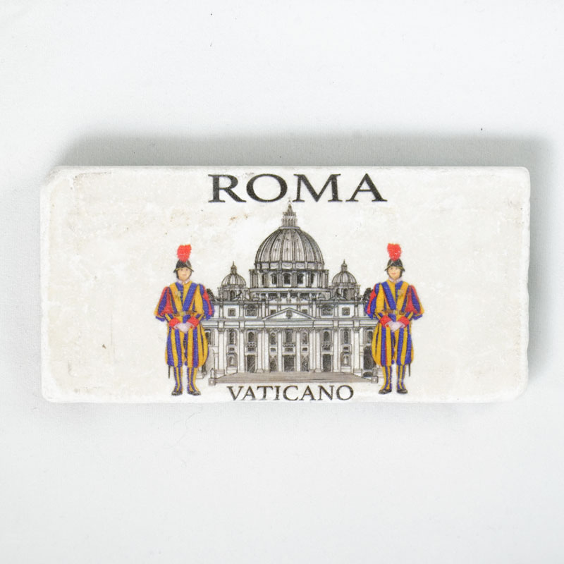 Calamita in vero marmo italiano, souvenir ricordo di Roma, a forma rettangolare con raffigurati San Pietro