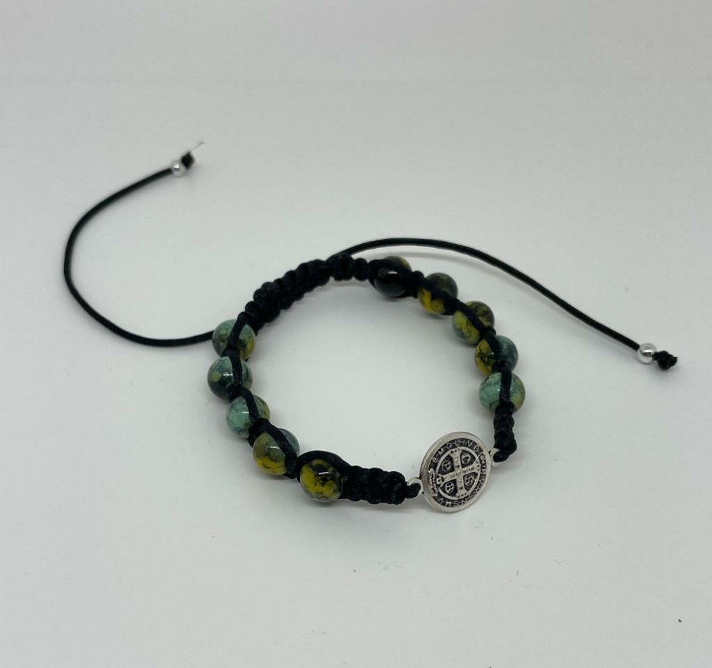 Rosary bracelet in green glass and rope and Saint Benedict medal