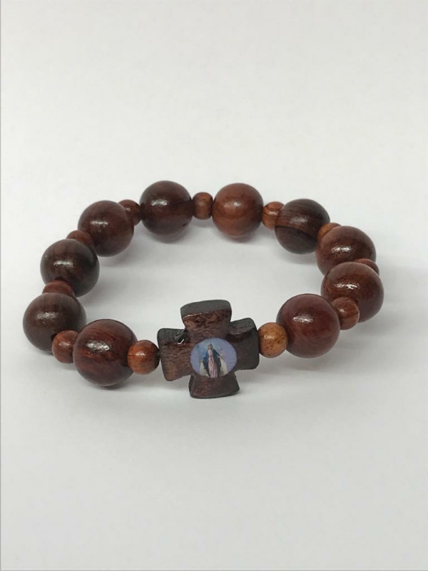 Rosary bracelet in wood with cross and image of Merciful Jesus and the Miraculous Lady