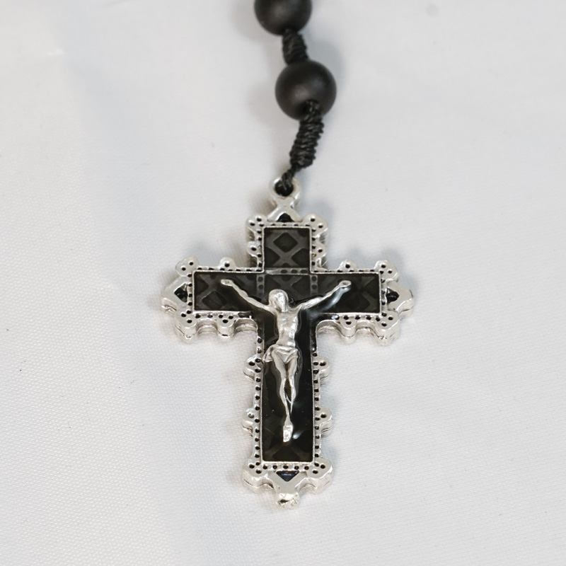 Rosary made of black frosted glass and rope, four metal cross mysteries, beads:8mm