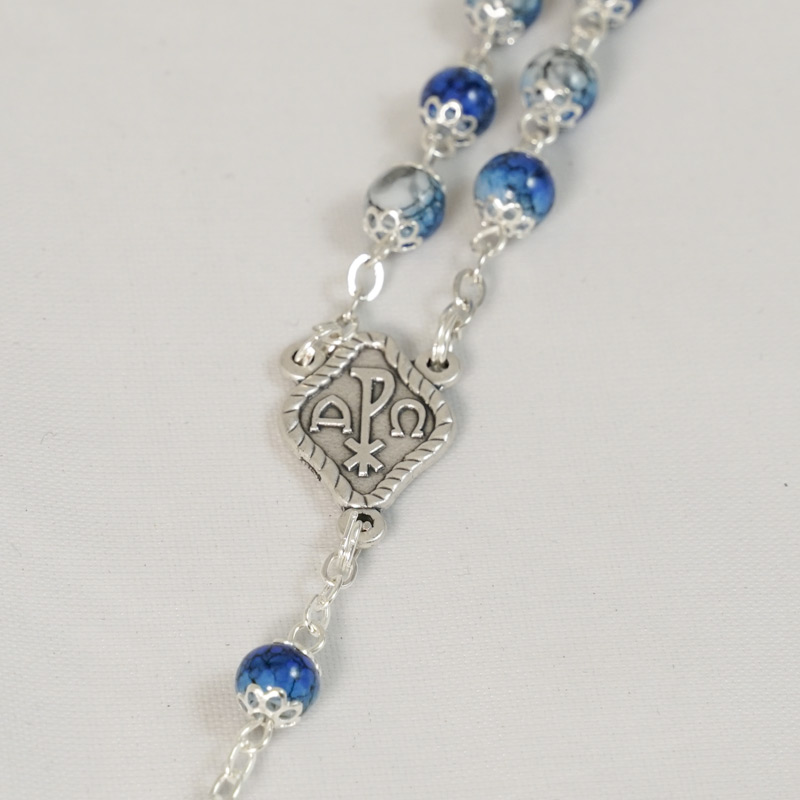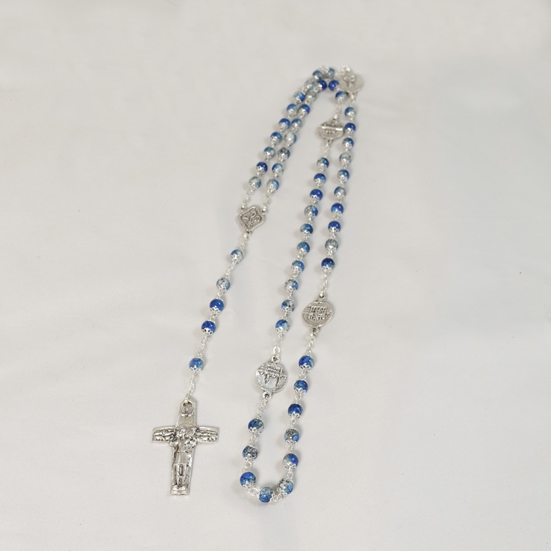 Rosary made of light blue spotted glass beads (6mm) with good sheperd cross and the four Basilcas