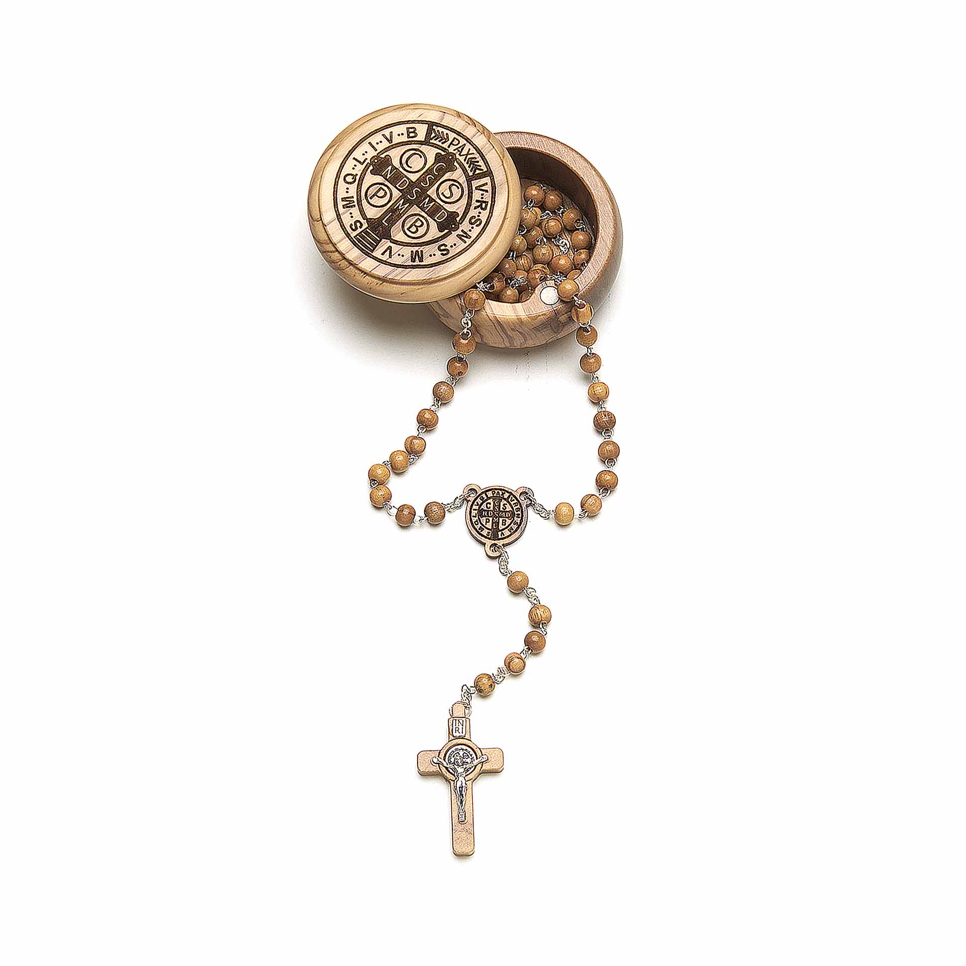 All’interno del cofanetto si trova un rosario finemente lavorato, simbolo di preghiera e meditazione, che invita a momenti di riflessione e connessione spirituale. Le grani del rosario, anch’esse in ulivo, sono levigate e scelte con cura, offrendo una piacevole sensazione al tatto. Ogni grano rappresenta un momento di preghiera, cimentando la fede in un oggetto che può essere utilizzato quotidianamente o tenuto come un prezioso ricordo.