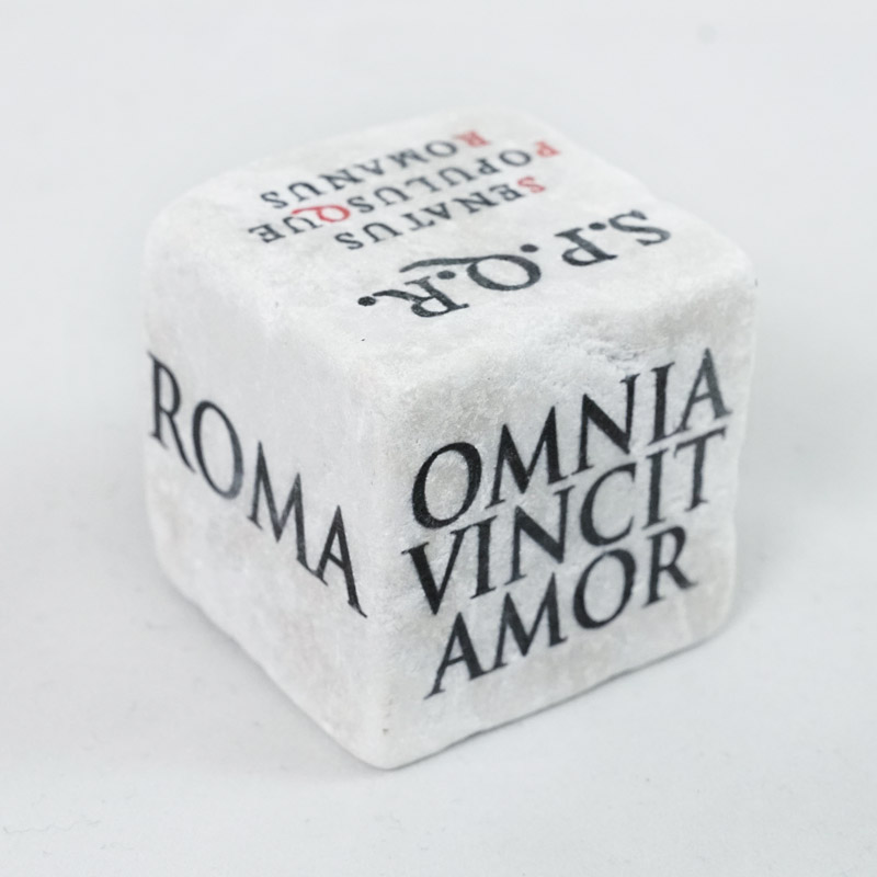 Dado in marmo italiano, souvenir di Roma, con scritte in Latino sulle facce