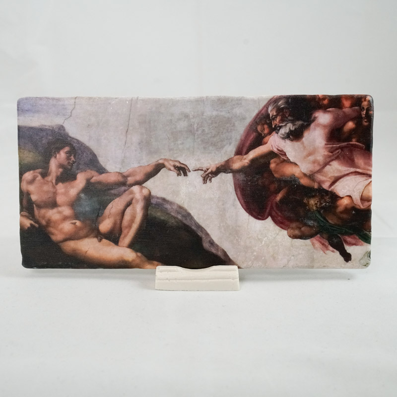 Targa in marmo lavorata a mano, souvenir ricordo di Roma, raffigurante la Creazione, con supporto