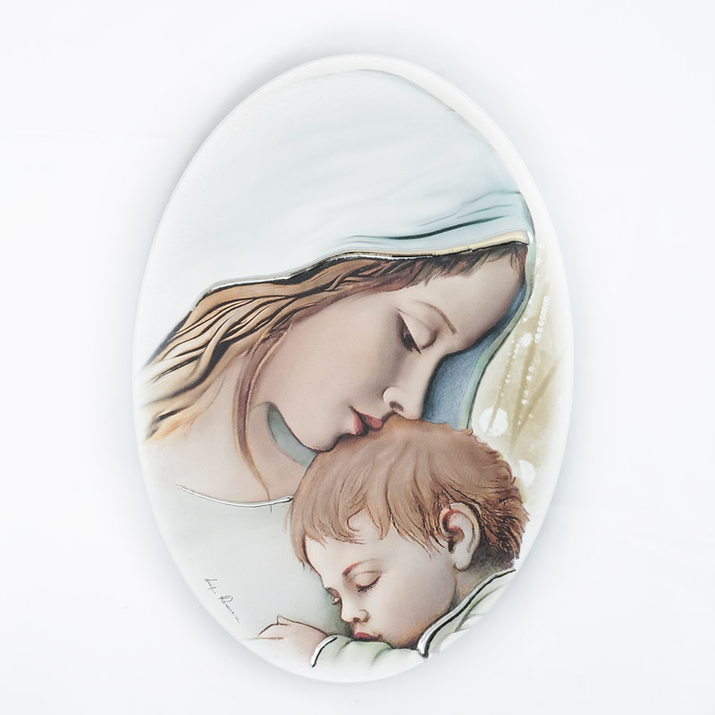 Quadro d’autore, realizzato dall’artista di talento Luigi Pesaresi, prodotto in legno arricchito da rilievi argentati, raffigurante Madonna con Bambino