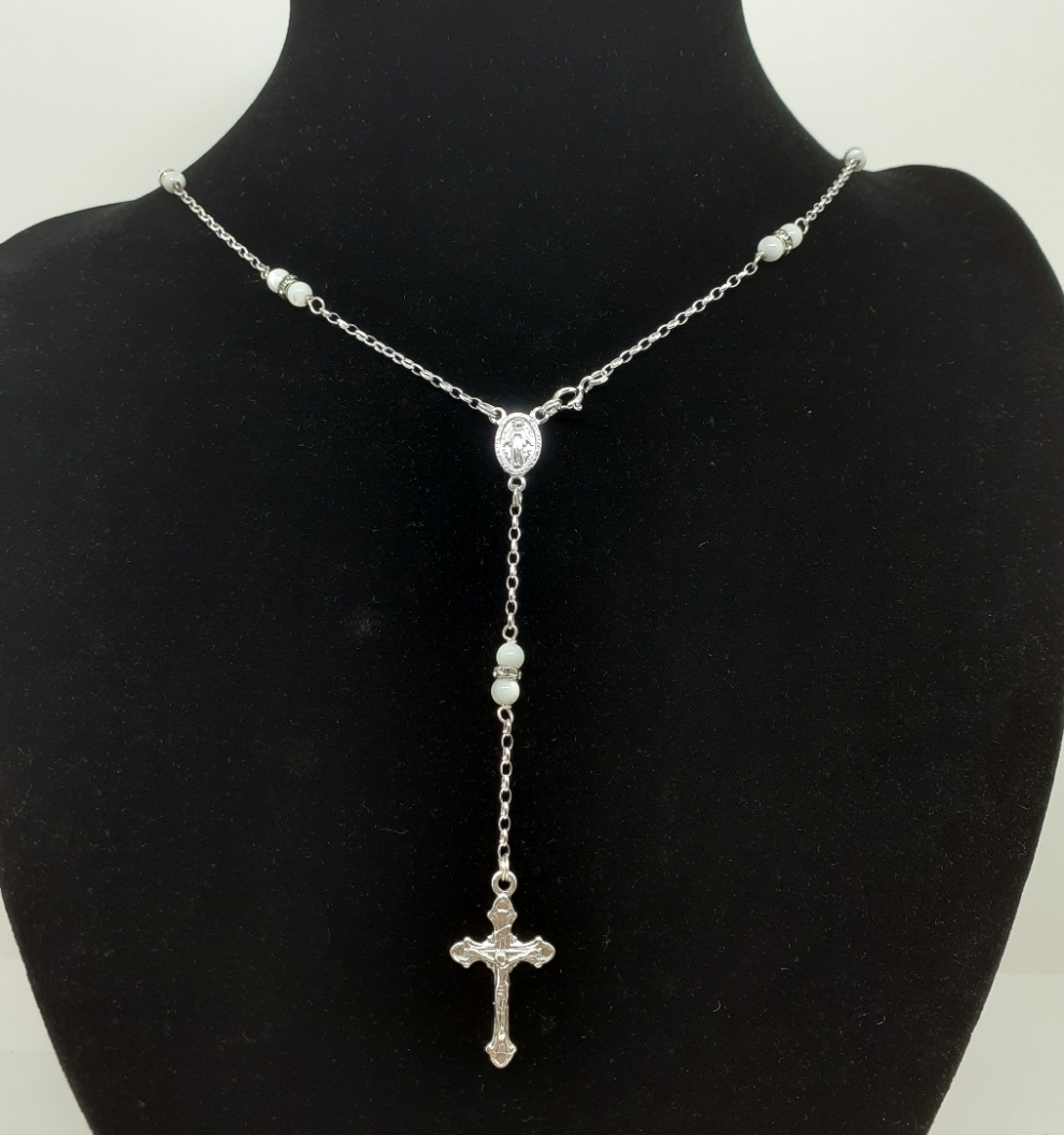Rosario a collana in argento con madre perla e swarovski e medaglia della Madonna Miracolosa