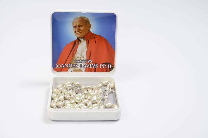 Rosario chicco di riso bianco con medaglia di Giovanni Paolo II e la croce del buon pastore