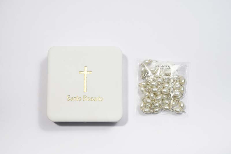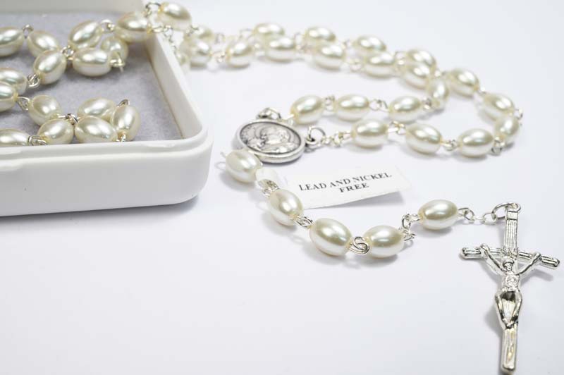 Rosario chicco di riso bianco con medaglia di Giovanni Paolo II e la croce del buon pastore, grani da 8 mm