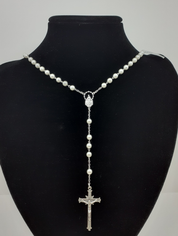 Rosario in argento con vetro perlato e la medaglia della Madonna Miracolosa