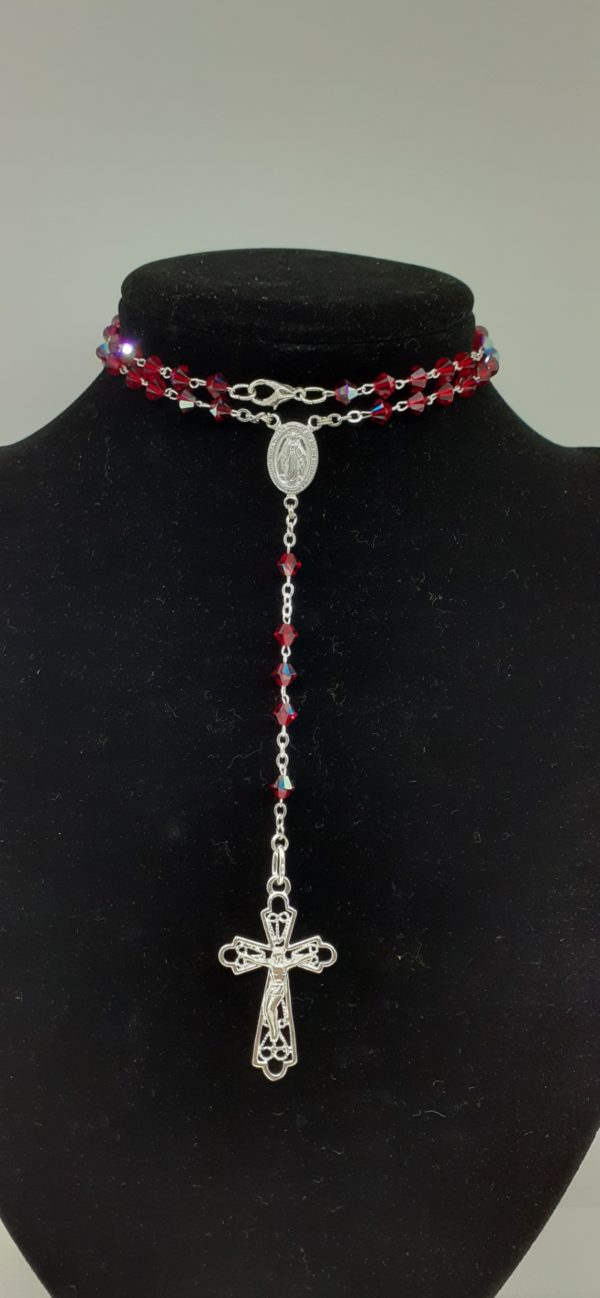 Rosario a collana in argento con cristalli di Swarovski e medaglia della Madonna Miracolosa