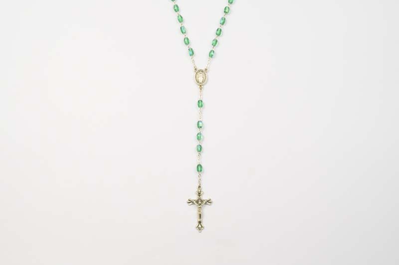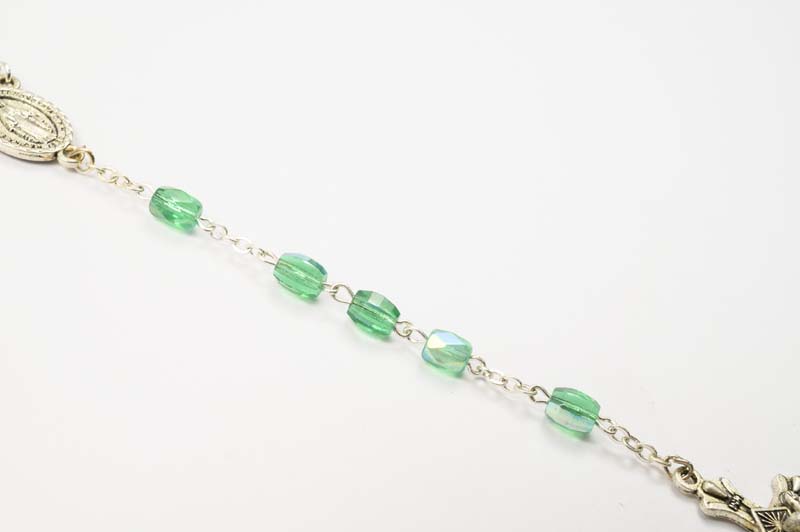 Rosario in cristallo verde con medaglia Madonna Miracolosa