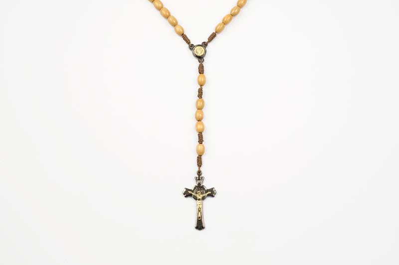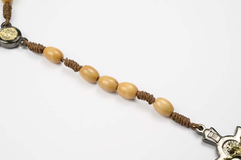 Rosario in legno chiaro con croce e medaglia di San Benedetto rilegato in corda grani da 8 mm