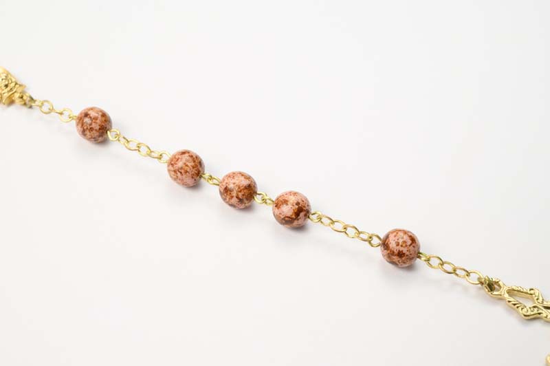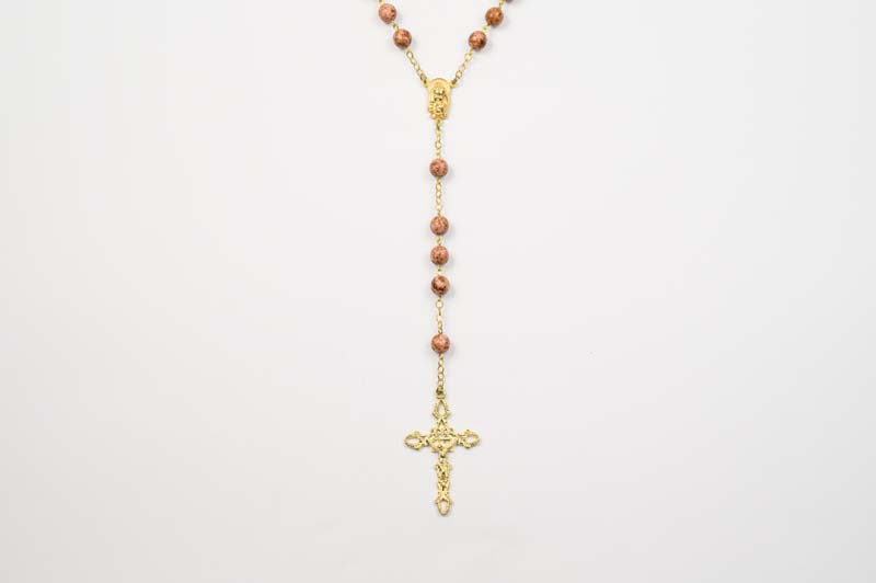Rosario in vetro colorato rosa maculato con medaglia Vergine e croce dorata