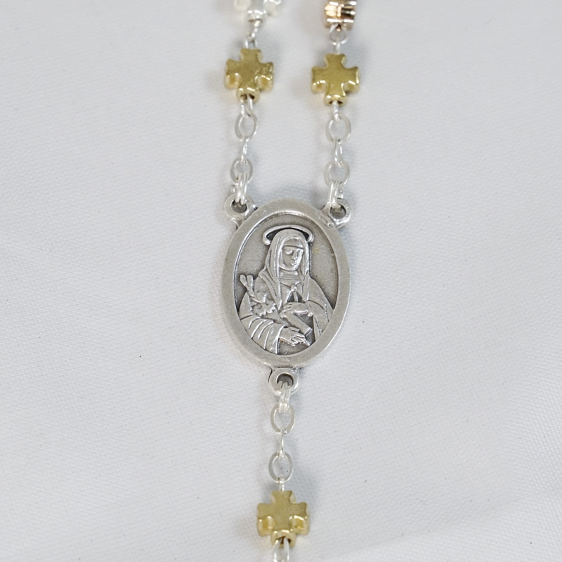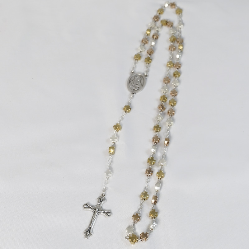 Rosario di Santa Caterina in metallo con grani a forma di croce celtica a colori alternati oro, argento e bronzo, grani 8mm