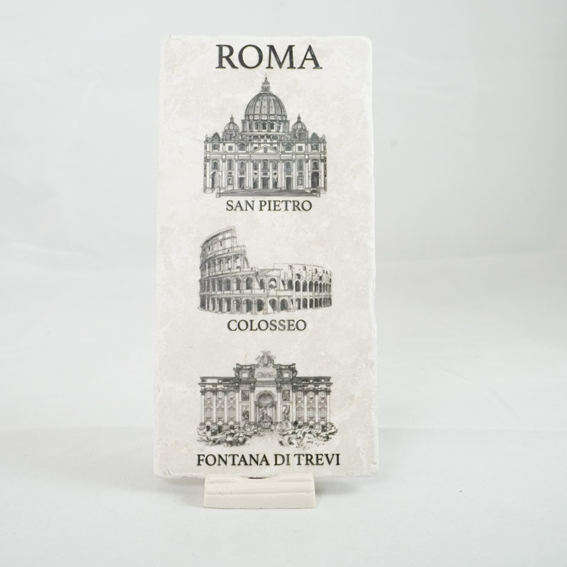 Targa in marmo lavorata a mano, souvenir ricordo di Roma, raffigurante Colosseo, San Pietro, Fontana di Trevi, con supporto